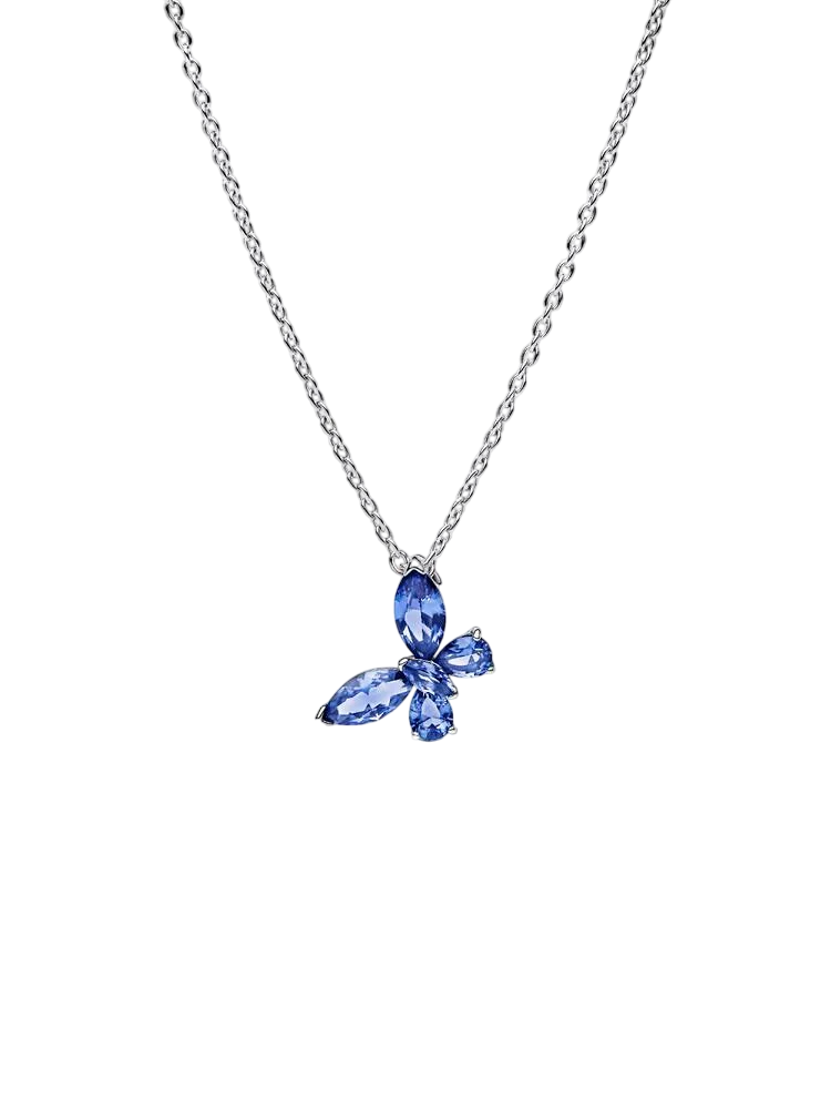 Expanda as suas asas e transforme o seu look com este colar de prata. Com cristais man-made azuis de corte marquesa e em forma de pera, uma borboleta pende graciosamente da corrente.