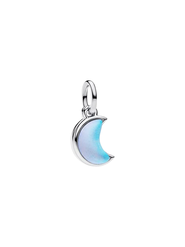 Leve-a até à lua. Esta conta pendente dupla de prata apresenta uma lua crescente em vidro iridescente pedra da lua e outra gravada com uma mensagem emotiva. Uma recordação radiante do brilho infinito do amor.