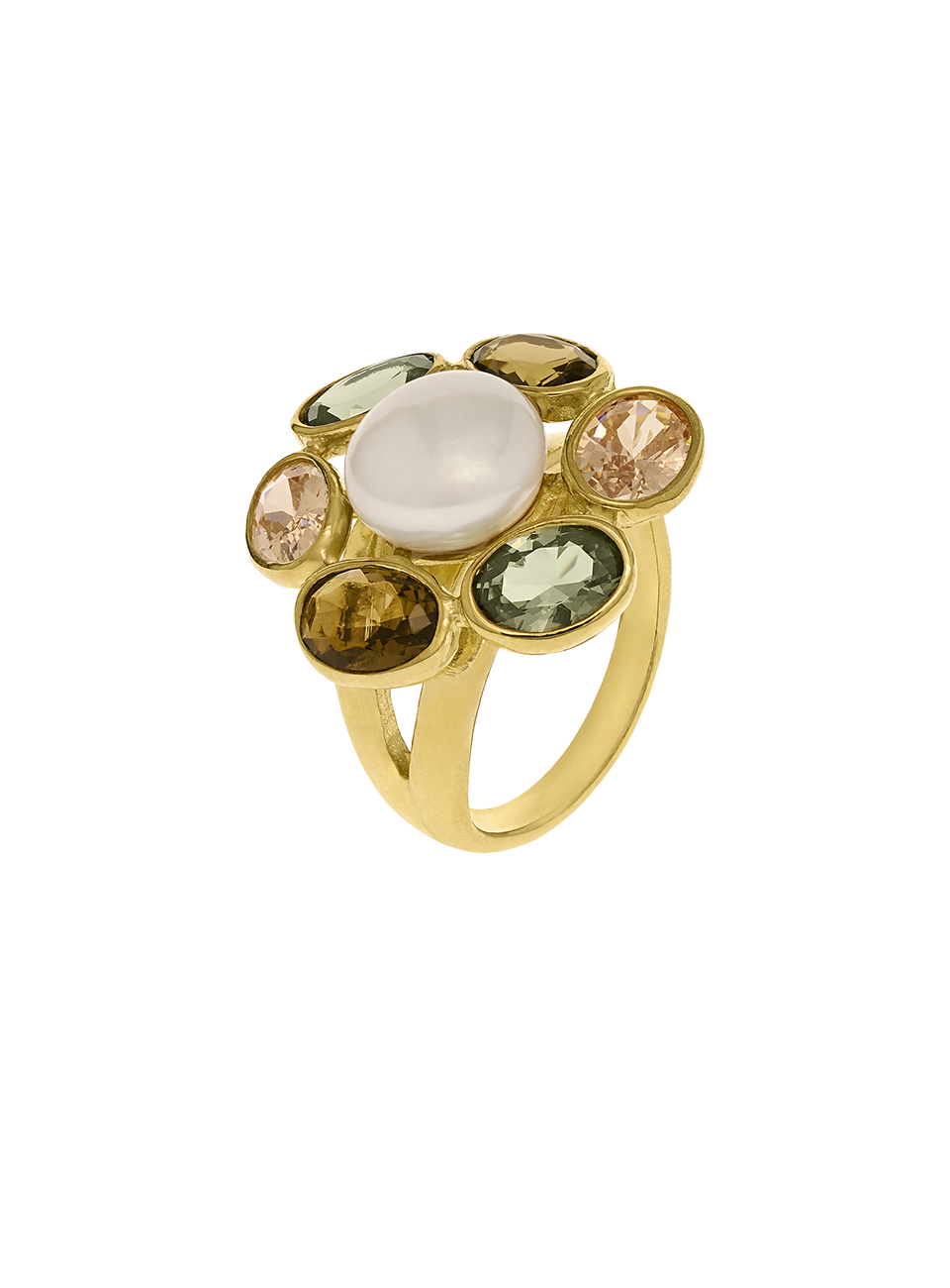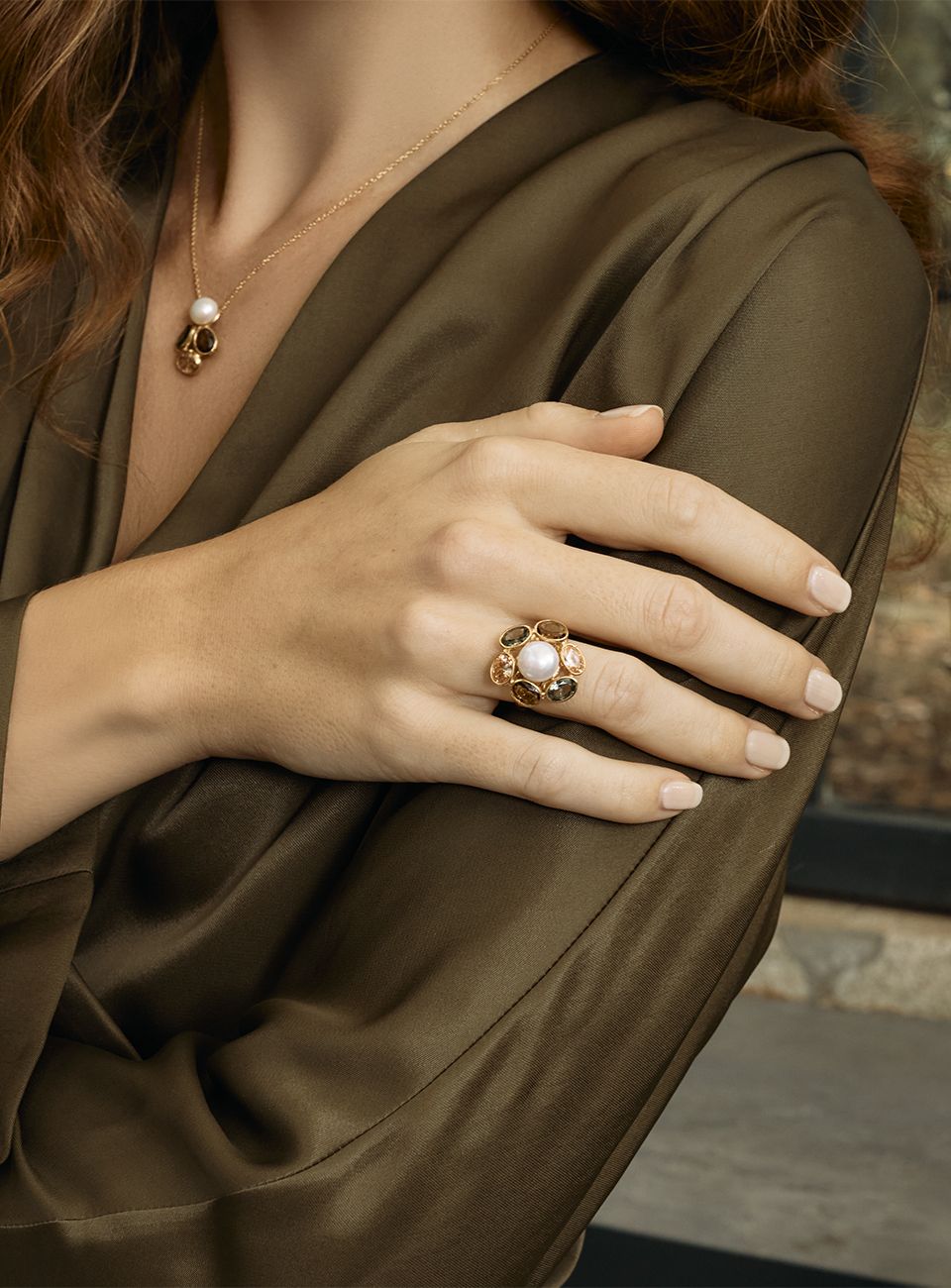 Anel Evergreen, ajustável, em prata de lei, banho de ouro com pérola de cultura e quartzos castanho e verde. Há uma magia que só acontece quando o mundo lá fora arrefece. Cada detalhe da joia reflete a essência do inverno: delicada, mas imponente, como a estação que transforma o mundo num cenário introspectivo.