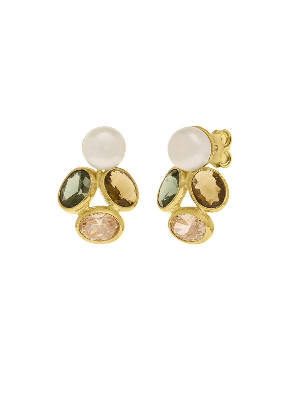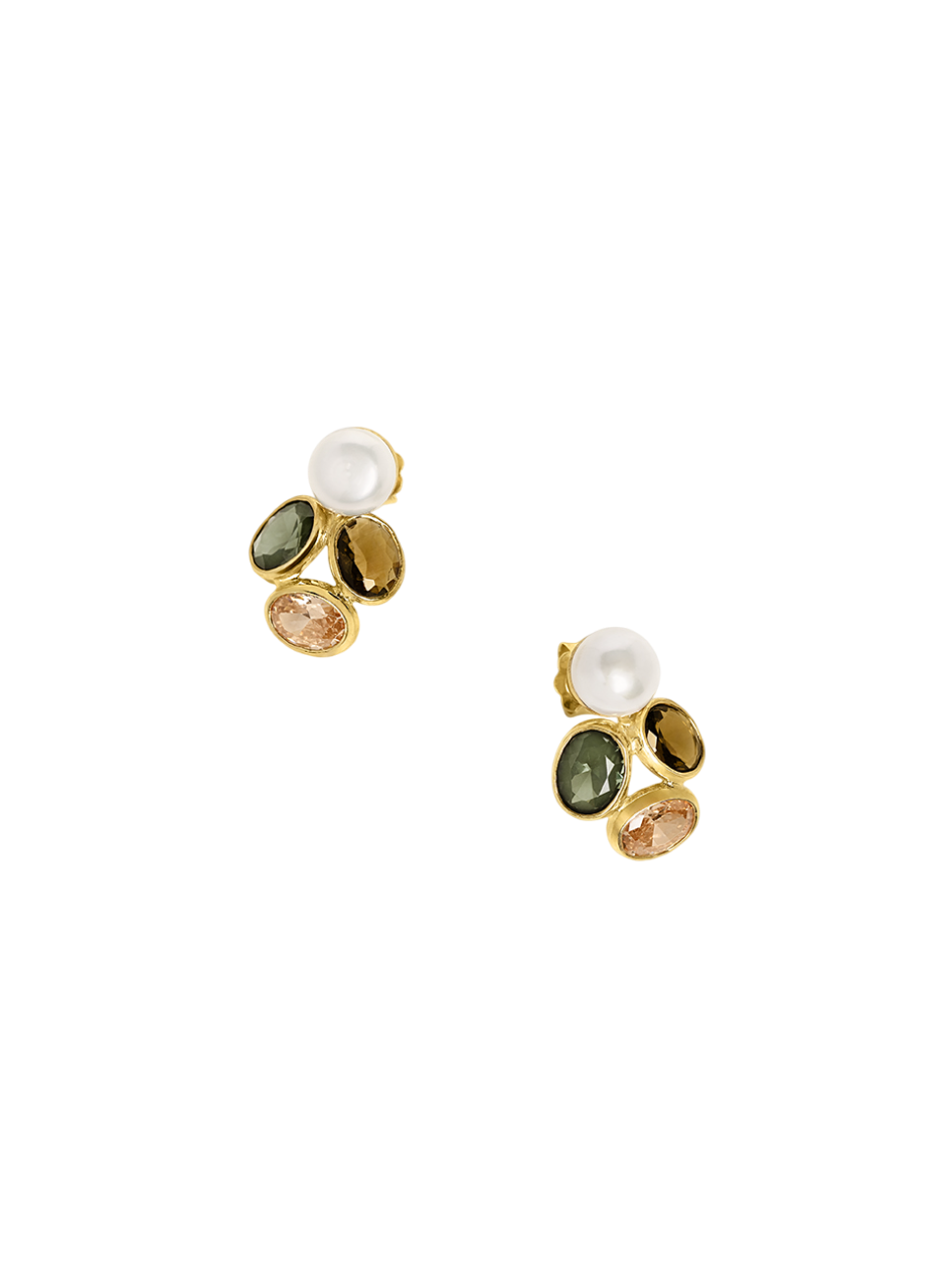 Brincos Evergreen em prata de lei, banho de ouro com pérola de cultura e quartzos castanho e verde. Há uma magia que só acontece quando o mundo lá fora arrefece. Cada detalhe da joia reflete a essência do inverno: delicada, mas imponente, como a estação que transforma o mundo num cenário introspectivo. Escolhemos a calma – e, acima de tudo, a presença.