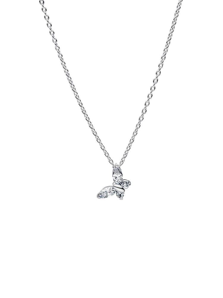 Expanda as suas asas e transforme o seu look com este colar de prata. Com cristais man-made transparentes de corte marquesa e corte brilhante, uma borboleta pende graciosamente da corrente.
