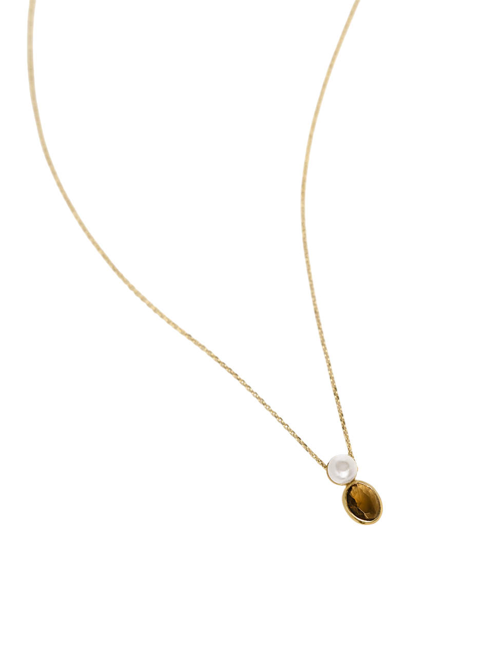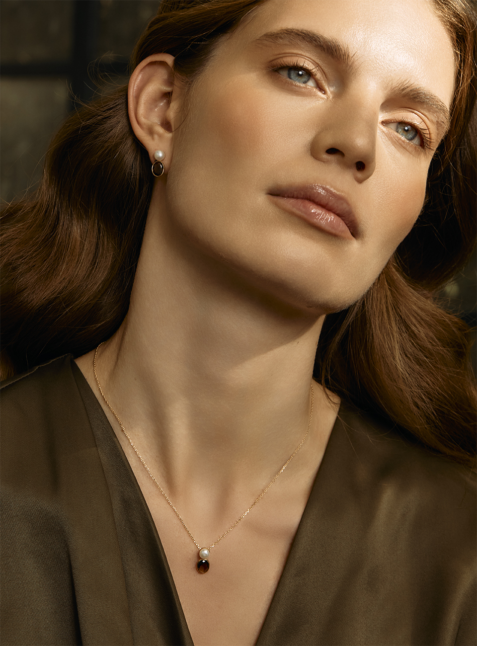 Colar Heaven em prata de lei, banho de ouro com pérola de cultura e quartzos castanho. Há uma magia que só acontece quando o mundo lá fora arrefece. Cada detalhe da joia reflete a essência do inverno: delicada, mas imponente, como a estação que transforma o mundo num cenário introspectivo.