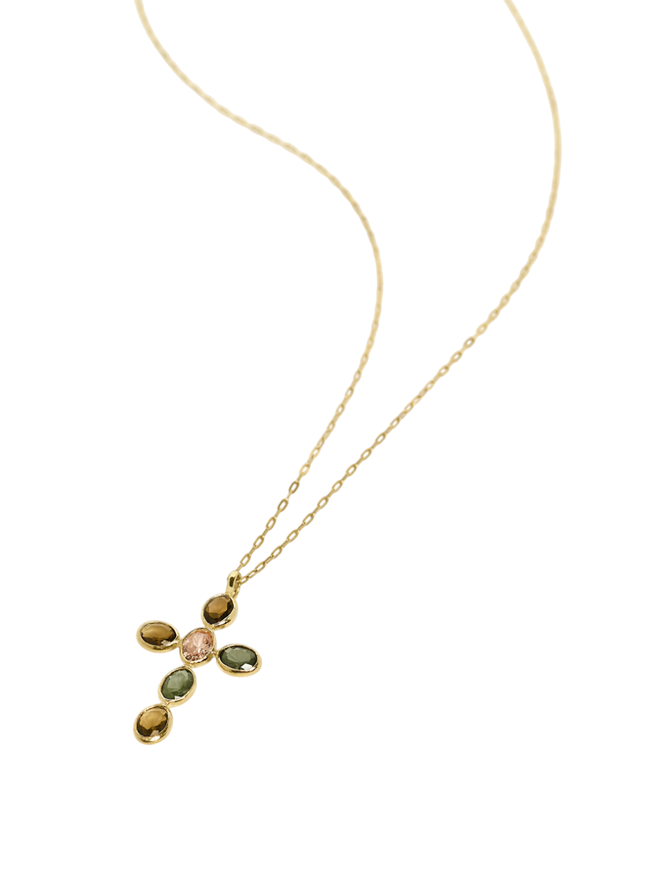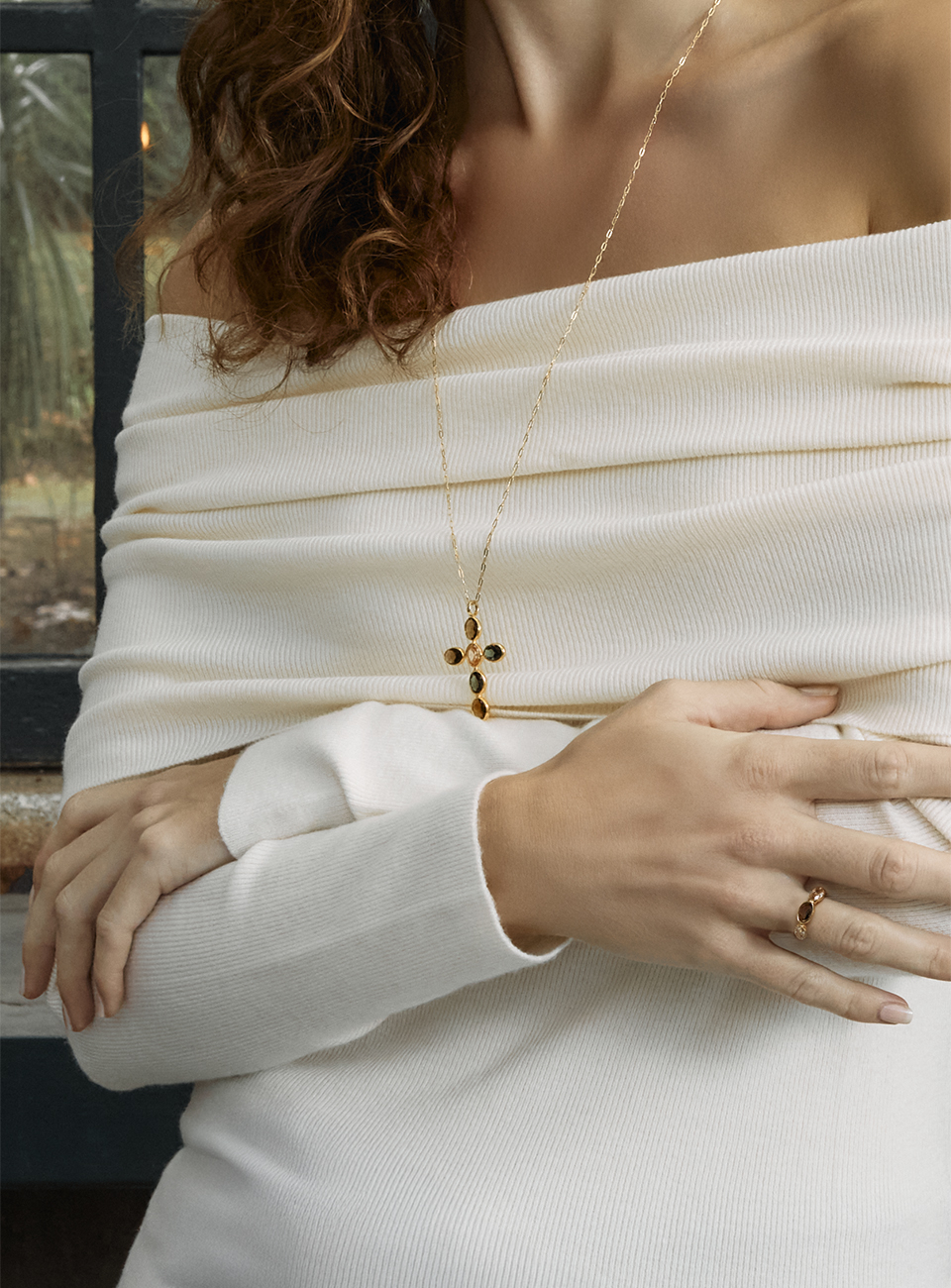 Colar Memória em prata de lei, banho de ouro com quartzos em tons castanhos e verdes. Esta joia apresenta uma cruz pendente e um fio longo, que oferece a versatilidade de ser usado de várias formas, permitindo criar diferentes looks. Há uma magia que só acontece quando o mundo lá fora arrefece. Cada detalhe da joia reflete a essência do inverno: delicada, mas imponente, como a estação que transforma o mundo num cenário introspectivo.