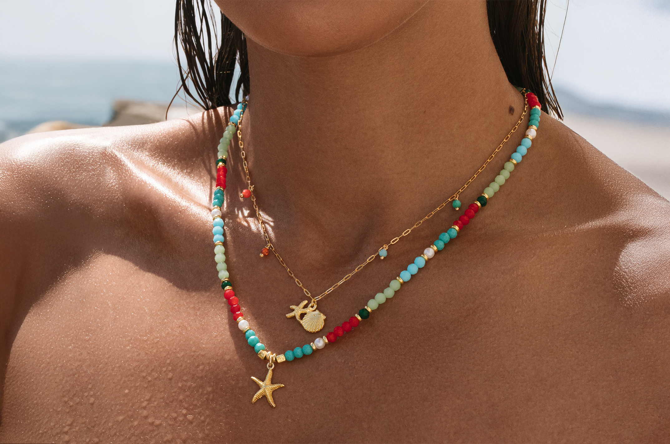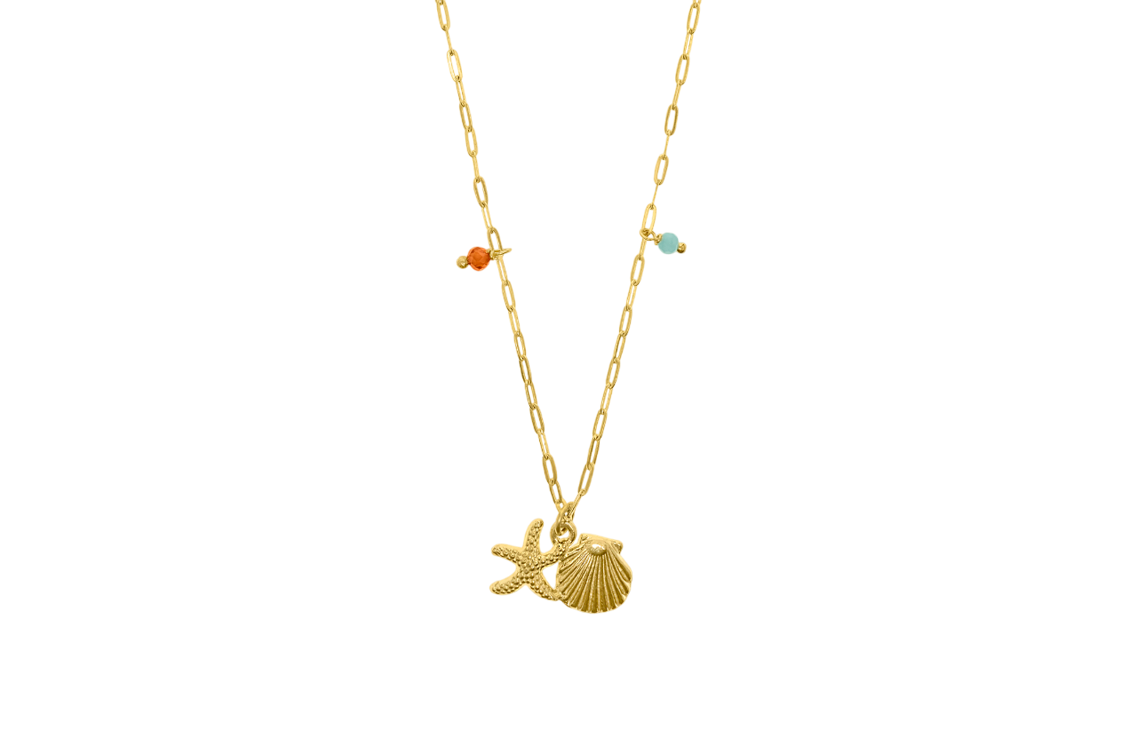 Colar Seashore em prata de lei, banho de ouro com cristais coloridos, concha e estrela do mar pendente. Lembra-se daquela sensação de passear na praia, com o sol na pele, e encontrar conchas que guardávamos para levar como memória daquele dia? Trazemos essa magia para estas joias que são pedaços de verão que pode levar sempre consigo. Porque o verão merece durar mais que uma estação. Coleção de Verão Eugénio Campos Jewels.