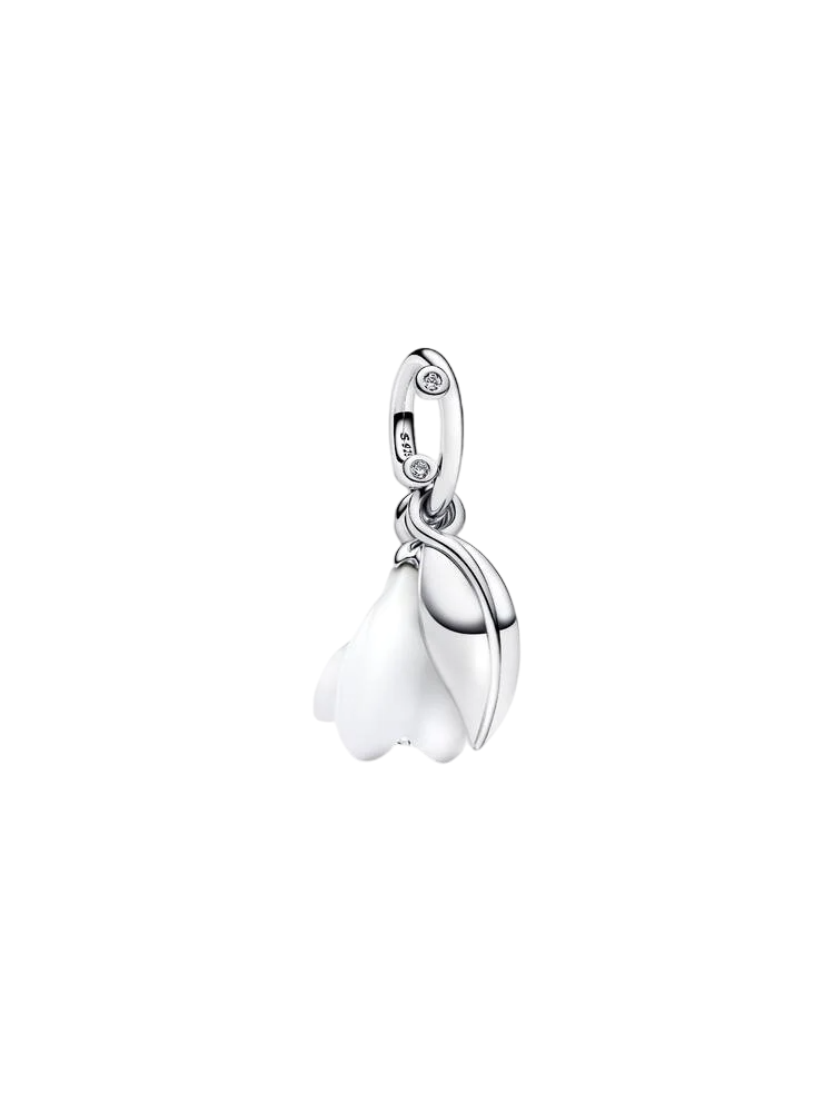 Floresça com coragem – e leve consigo a lembrança. Esta conta de prata apresenta uma flor floco de neve em vidro Murano branco, zircónias cintilantes e uma folha pendente gravada com a mesma mensagem.