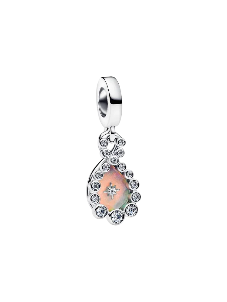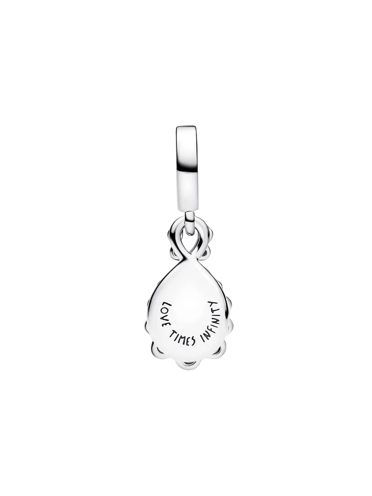 Este pendente duplo de prata brilha com zircónias transparentes numa conta e resina opala aurora criada em laboratório na outra. Gravada com “LOVE TIMES INFINITY”, é um tributo às ligações duradouras.