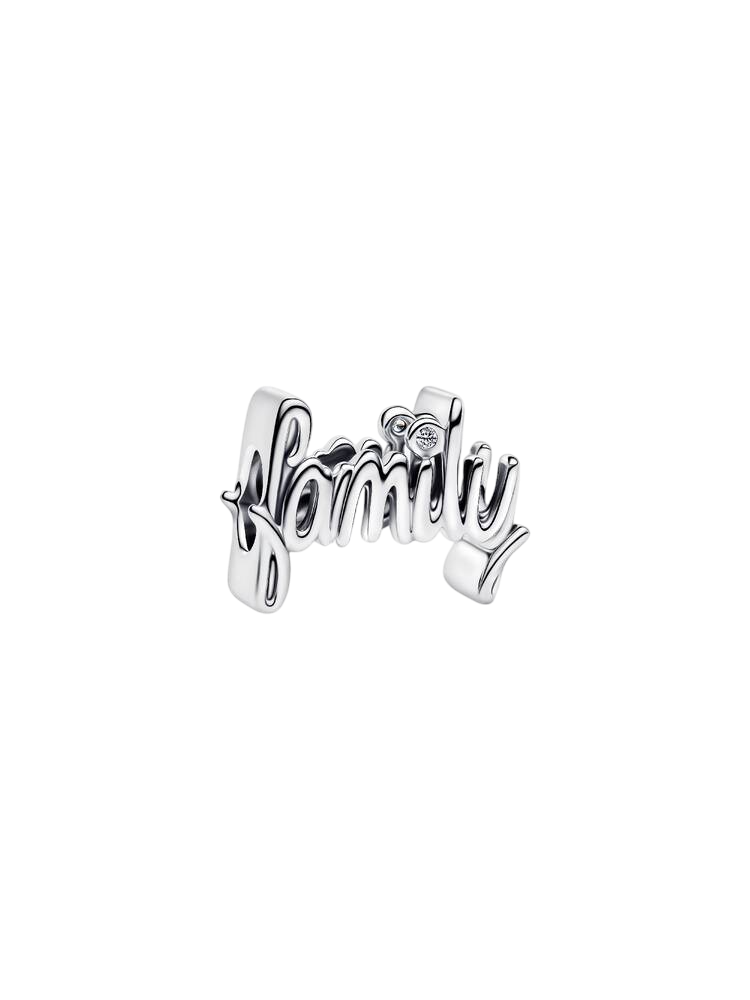 Um lembrete brilhante do que é mais importante. Esta conta de prata apresenta a inscrição “family” escrita à mão com um ponto de zircónias sobre o “i”. De fabrico especializado, é um tributo intemporal ao coração de cada.